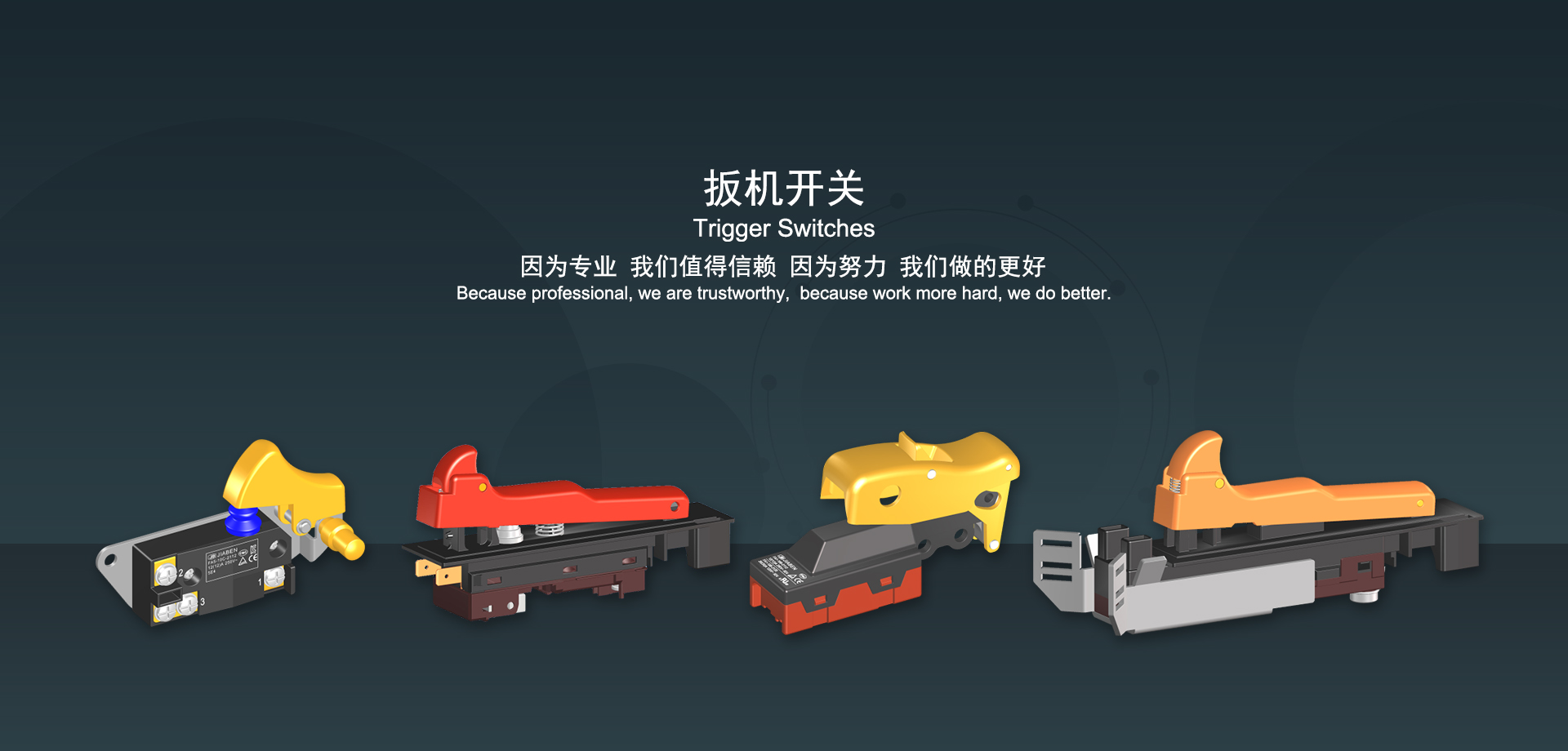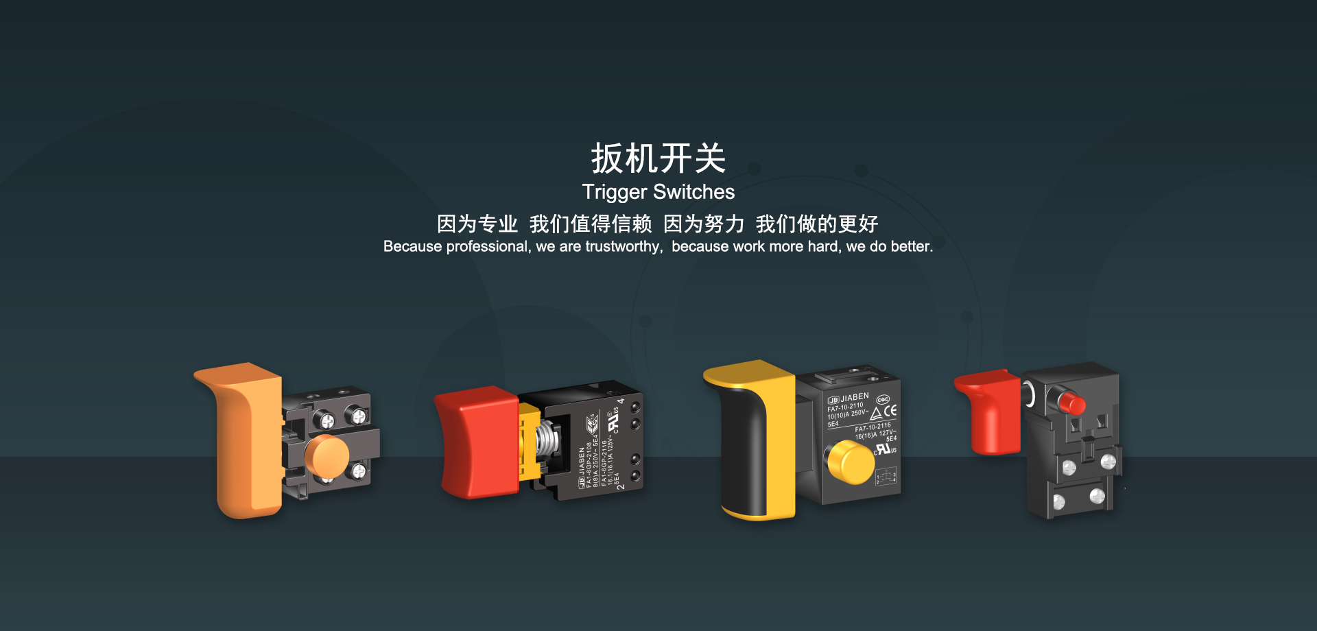 浙江佳奔電子有限公司始建于1986年,坐落于浙江省樂清市虹橋鎮東電子信息產業園內,現有職工700多人,資產總額超3億元。公司主要經營“JIABEN”牌微動開關、蹺板開關、按鈕開關、扳機開關、調速開關和電位器開關等各類交、直流器具開關和各類交、直流線路板模塊等產品,主要應用于交、直流電動工具、電動園林工具、清潔器具、家用電器和小型機床等行業,是集產品設計、研發(fā)、制造、銷售和服務于一體的國家高新技術企業。JIABEN was founded in 1986, located in East Electronic Information Industry Park, Hongqiao Town, Yueqing City, Zhejiang Proviance, existing staff more than 700 peoples, more than 300 million RMB worth of assets. Company is mainly engaged in "JIABEN" brand Micro Switch, Rocker Switch, Push-button Switch, Trigger Switch, Speed Regulating Switch, Potentiometer Switch and other kinds of appliance switch and all kinds of AC or DC circuit board module, such as more than 100 series, 8000 kinds of models of products, mainly used in AC or DC Power-tools, Power Gardening Tools, Cleaning Appliances, Household Appliances and Small Machine Tool and other industries, is the collection product design, research and development, manufacturing, sales and service in one of the national high and new technology enterprise.